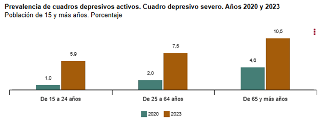 Segundo a Enquisa de Saúde de España (EsdE) do ano 2023(4) o 14,6% da poboación de 15 ou máis anos presentaba un cuadro depresivo durante as dúas semanas anteriores á entrevista e un 8,0% un cadro depresivo severo. A prevalencia desta sintomatoloxía aumentou respecto ao 2020 (5,5 puntos máis en canto a depresión severa e 3,7 puntos noutros cadros depresivos).