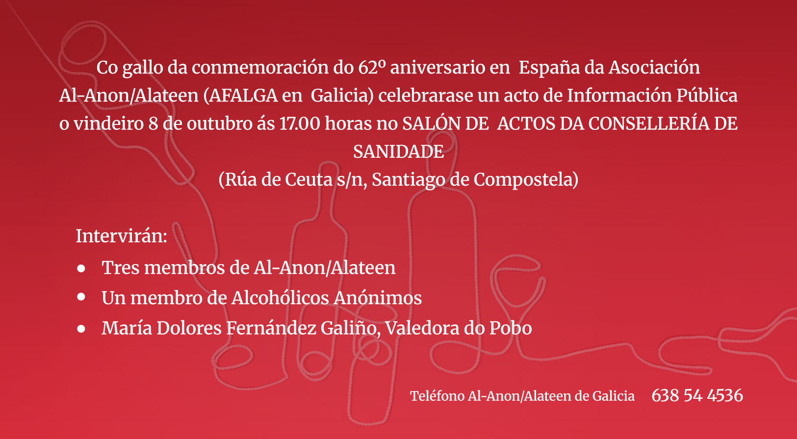 Co motivo da conmemoración do 62° aniversario en España da Asociación Al-Anon/Alateen (AFALGA en Galicia), o vindeiro 8 de outubro ás 17:00 horas terá lugar un acto de Información Pública no Salón de Actos da Consellería de Sanidade (Rúa de Ceuta s/n, Santiago de Compostela).